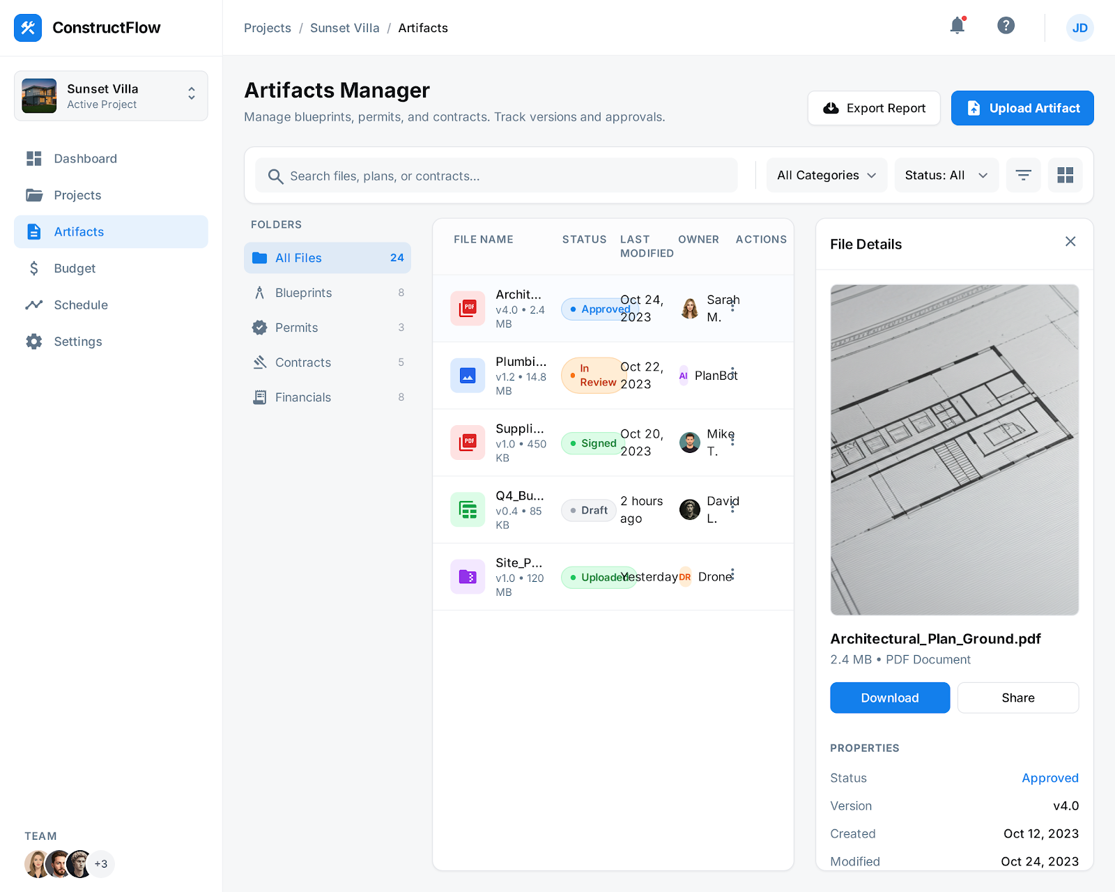 - Artifacts Panel (plans, BoQs, estimates, contracts, permits)