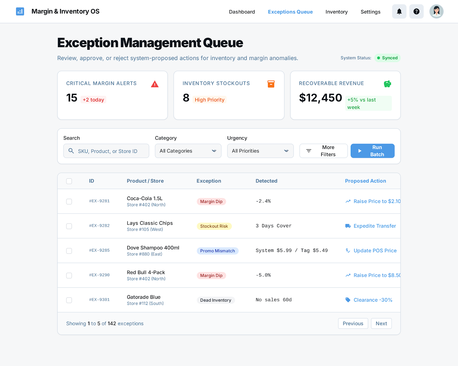 Operating room: ingest → detect exceptions → propose actions → approve → execute.