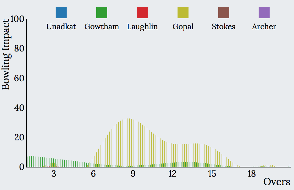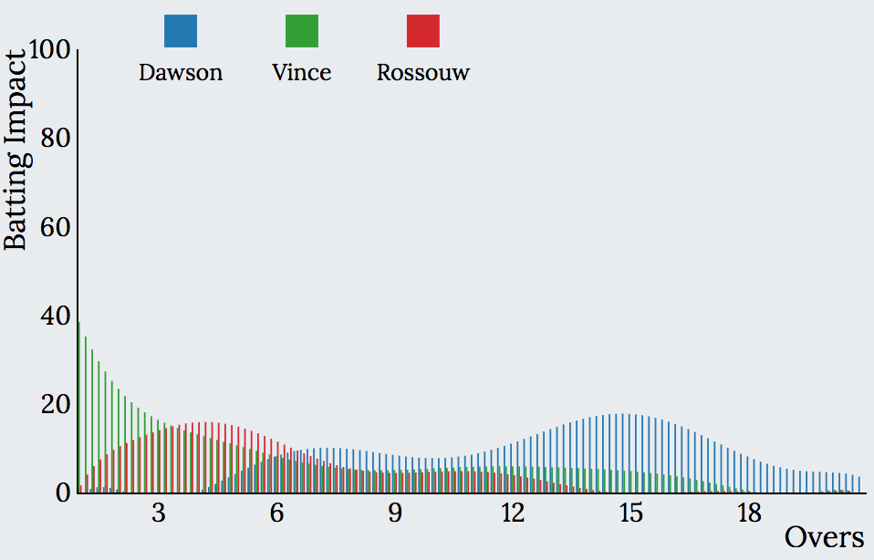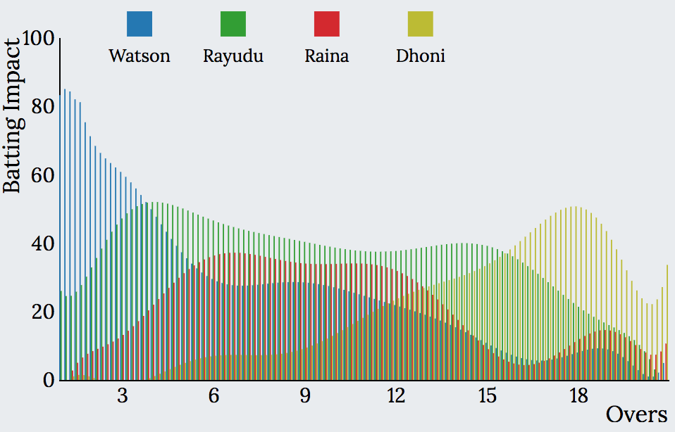 These charts show the impacts created by different players during various phases of the game. Each player’s impact is shown in different color. It can be observed that CSK’s batting impact chart is consistently high right from the Powerplay through the middle until the death overs. While Watson provided the initial impact, Rayudu and Raina made an impact during the middle overs and Dhoni created a significant impact in the death overs. This is how a batting impact chart of a top batting side would look like.