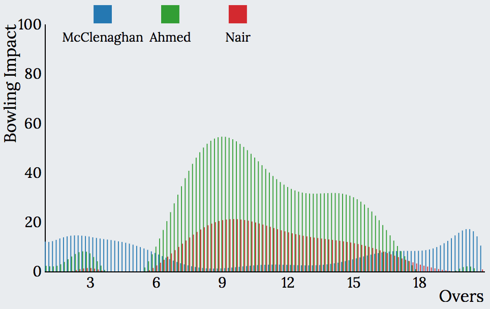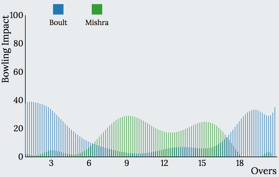 Similar analysis can be made for bowling impacts. Presented below are the bowling impact charts of SRH, MI and RCB for IPL 2018.