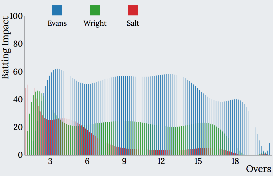 The new measure termed as Player Impact will take such factors into account. This will lead to a fairer comparison of players resulting in metrics which are neutral with respect to venue and match situations. While the exact mathematical equations are not included here, it is similar but not exactly the same as ESPNCricinfo’s SMART Stats for T20 Cricket.