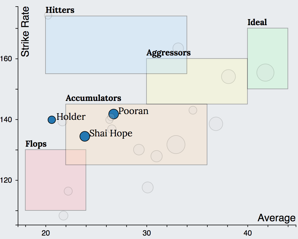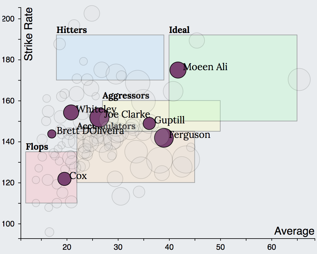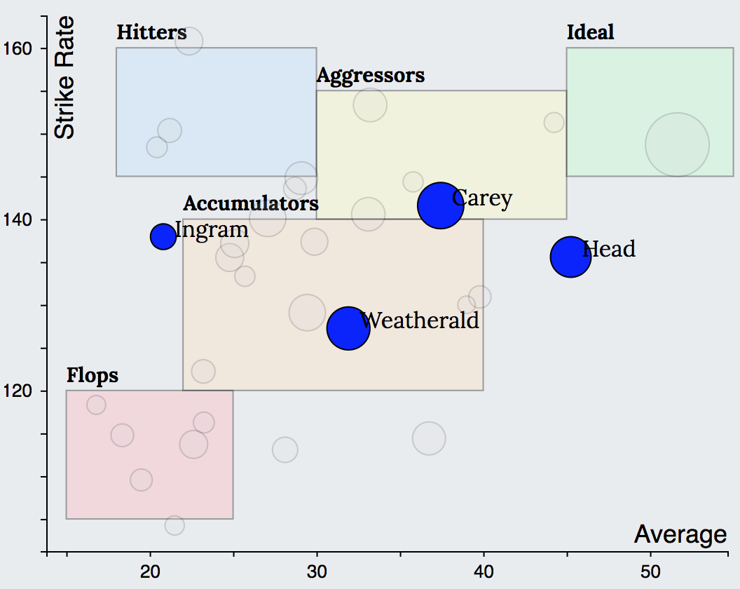 A quick glance at the batting charts of top ranked teams reveals that a minimum of four batsmen will need to score consistently throughout the season in order for the team to do well. While CSK had 3 Aggressors (Dhoni, Watson, Rayudu) and one Accumulator (Raina), Adelaide Strikers had 2 Aggressors (Carey, Head) and 2 Accumulators (Ingram, Weatherald). Worcestershire had 2 Aggressors (Joe Clarke, Guptill), 1 Accumulator (Ferguson) and 1 Ideal (Moeen Ali). KKR on the other hand seemed to have a wide variety of players suited for various stages of the game. They have 2 Hitters (Narine at top, Russell at the end of the innings), 1 Aggressor (Karthik) and 2 Accumulators (Lynn and Uthappa).