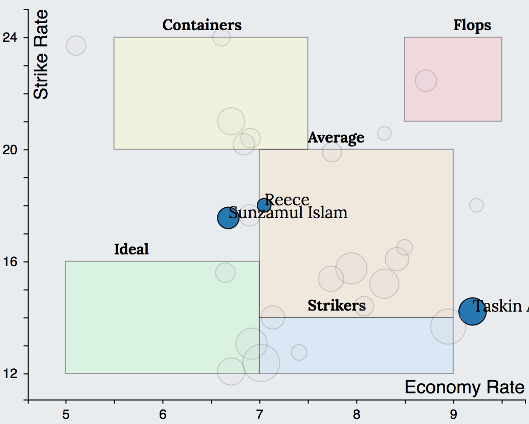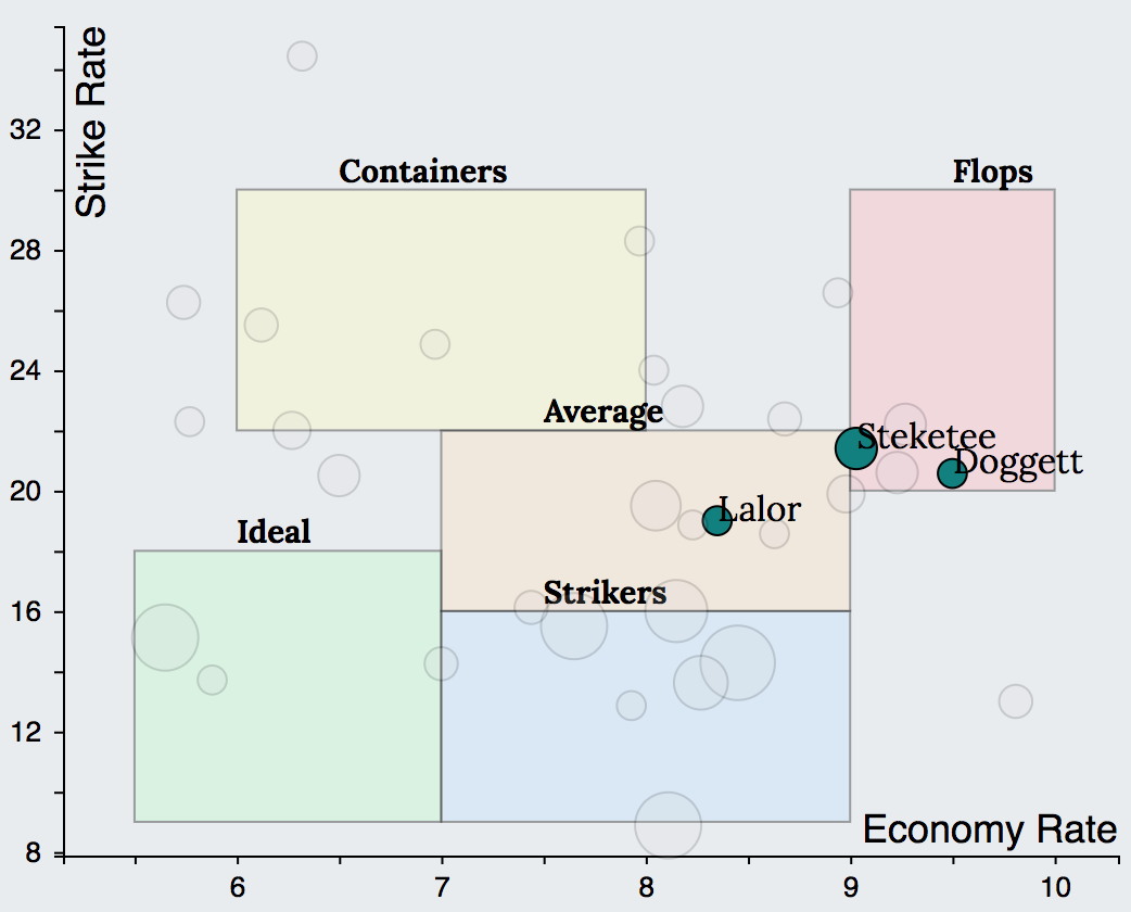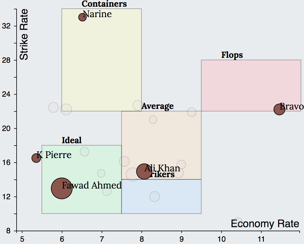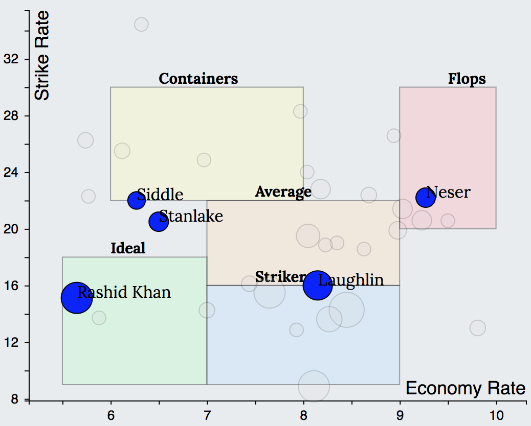 Similar to the batting charts, the bowling charts of few of the top ranked teams in the 2018 season reveals the following. SRH had 1 Ideal (Rashid) 2 Average (Sandeep, Kaul) and 2 Containers (Shakib, Bhuvaneshwar). Trinbago Knight Riders had 2 Ideals (K Pierre, Fawad Ahmed), 1 Average (Ali Khan) and 1 Container (Narine). Adelaide Strikers had 1 Ideal (Rashid), 1 Average (Laughlin) and 2 Containers (Siddle, Stanlake).