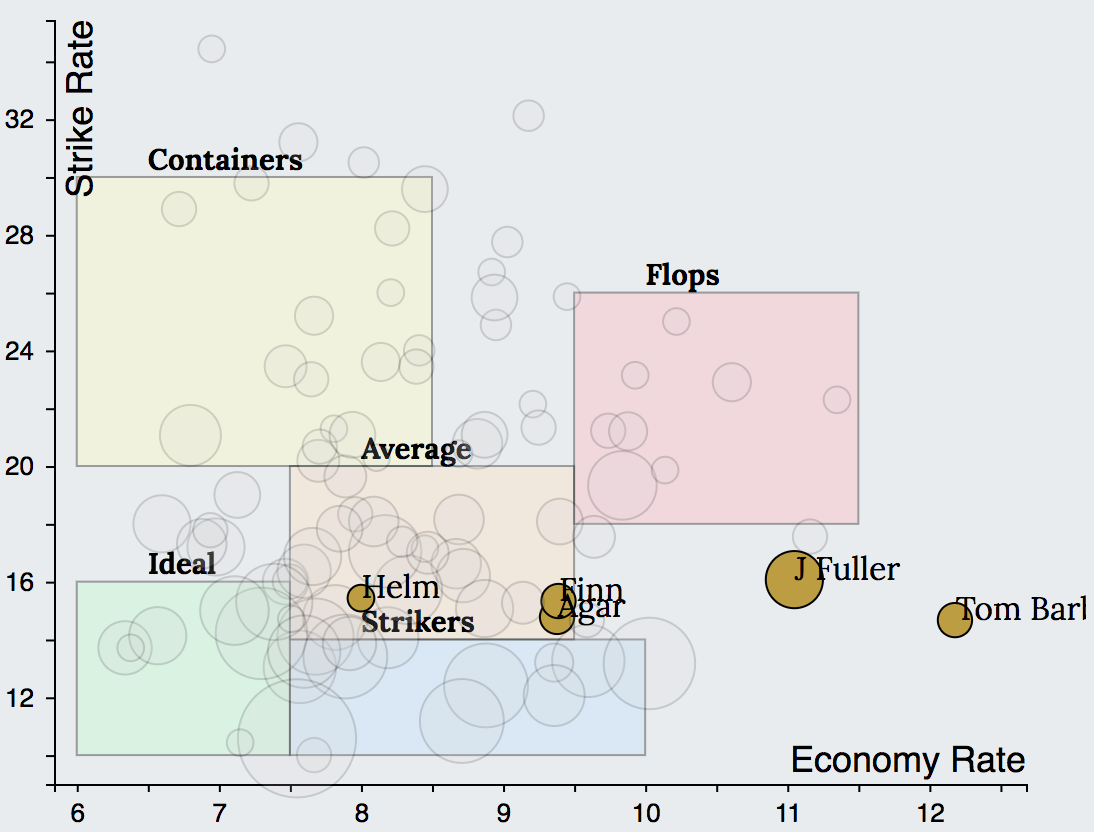 It is clear that such roles are missing in the bowling charts of bottom ranked teams leading to dismal bowling performances. While Brisbane and Middlesex for example had no bowler in Container or Striker category. Northamptonshire had two bowlers in Flops and no player in Average or Striker categories. Similar to batting, with no clear roles assigned, bowlers are often uncertain about going for wickets or containing runs, eventually leading to erroneous line and lengths.
