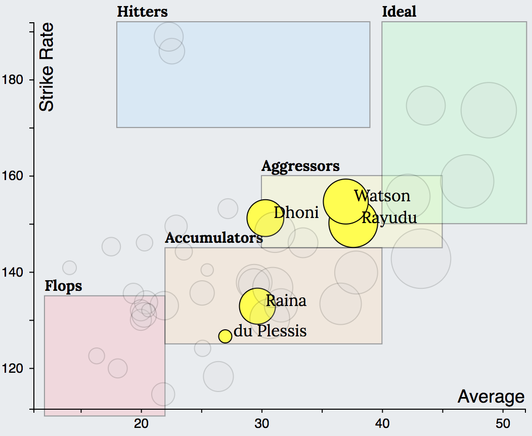 | Aggressors | Batsmen with good averages and good strike-rates. Batsmen who can adapt based on the game situation and perform consistently under pressure. | Dhoni, Watson, Rayudu |