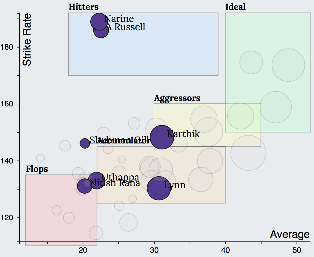 It is vital that the batting strategies be appropriately adapted based on the different combinations of players and roles assigned to them. In case of multiple aggressors, one of them is expected to bat through most of the innings and score majority of team’s runs like Rayudu, Watson did for CSK. With only one aggressor, the team expects one of the hitters to provide momentum to the batting innings like Narine and Russell did for KKR and the accumulators to play around them.