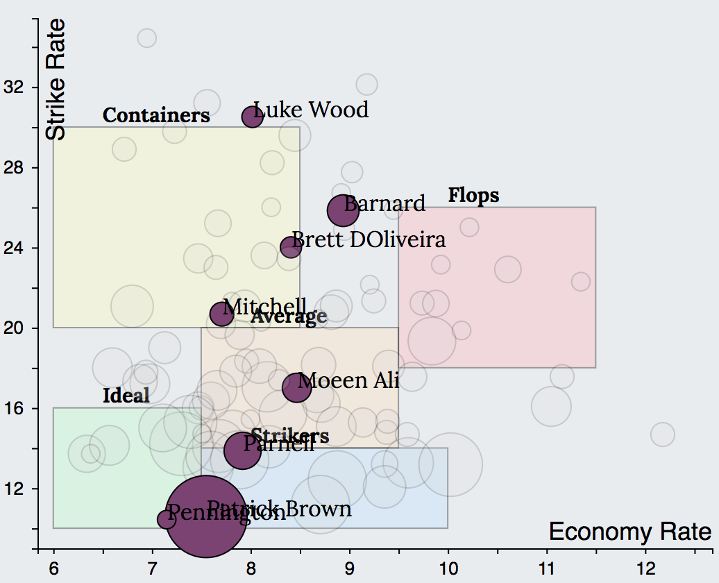 Further the traditional statistics also do not take into the account the match situation. For example, a bowler bowling in the Powerplays and death overs will have higher economy rates than someone bowling in the middle overs. Similarly in a game where both teams have scored in excess of 200, a batsman scoring at a SR of 140 will need to be penalised.
