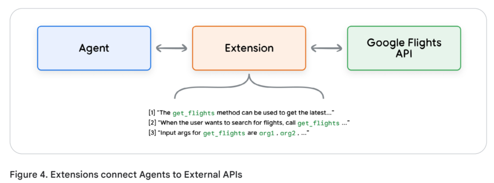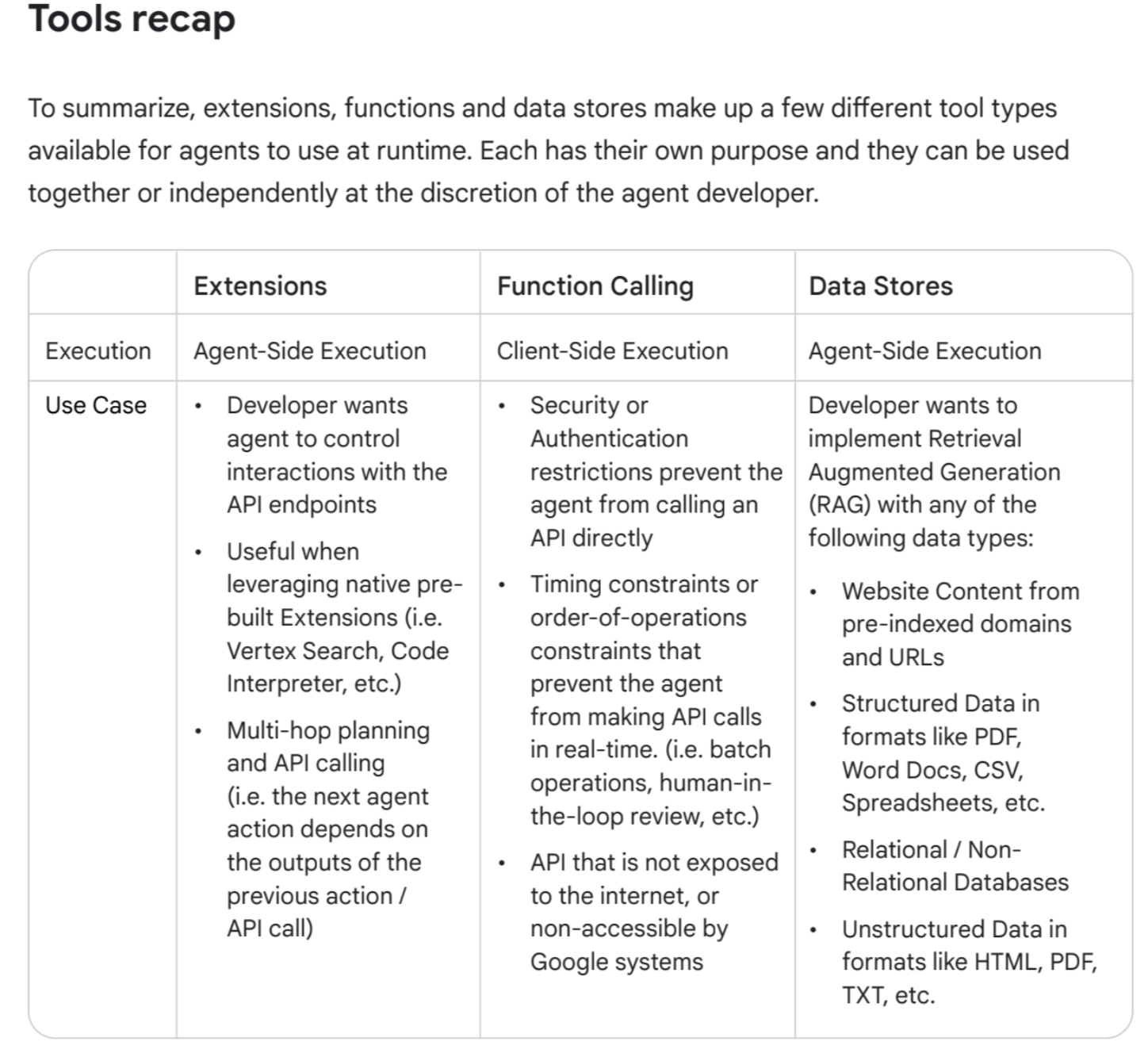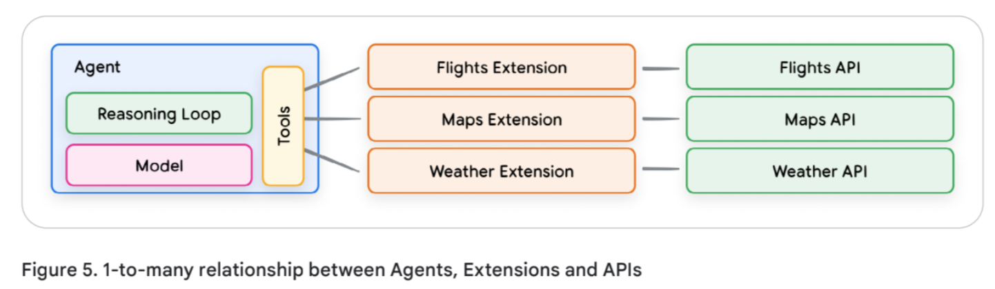 - Extensions (Agent-Side Execution): These tools bridge the gap between an agent and an external API. The agent is taught how to use the API endpoint and its parameters, and it makes the live API call directly. This is useful for leveraging pre-built integrations (e.g., Vertex Search, Code Interpreter) and for multi-hop planning where the next action depends directly on the previous API call's output.
