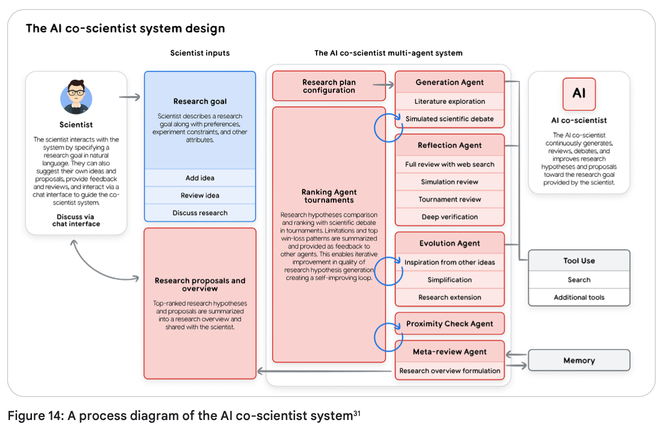 Google's AI Co-Scientist is a prime example of a multi-agent LLM system applied to scientific research. It utilizes a team of specialized agents to accelerate discovery by generating, evaluating, and refining hypotheses. It employs a "generate, debate, and evolve" approach.