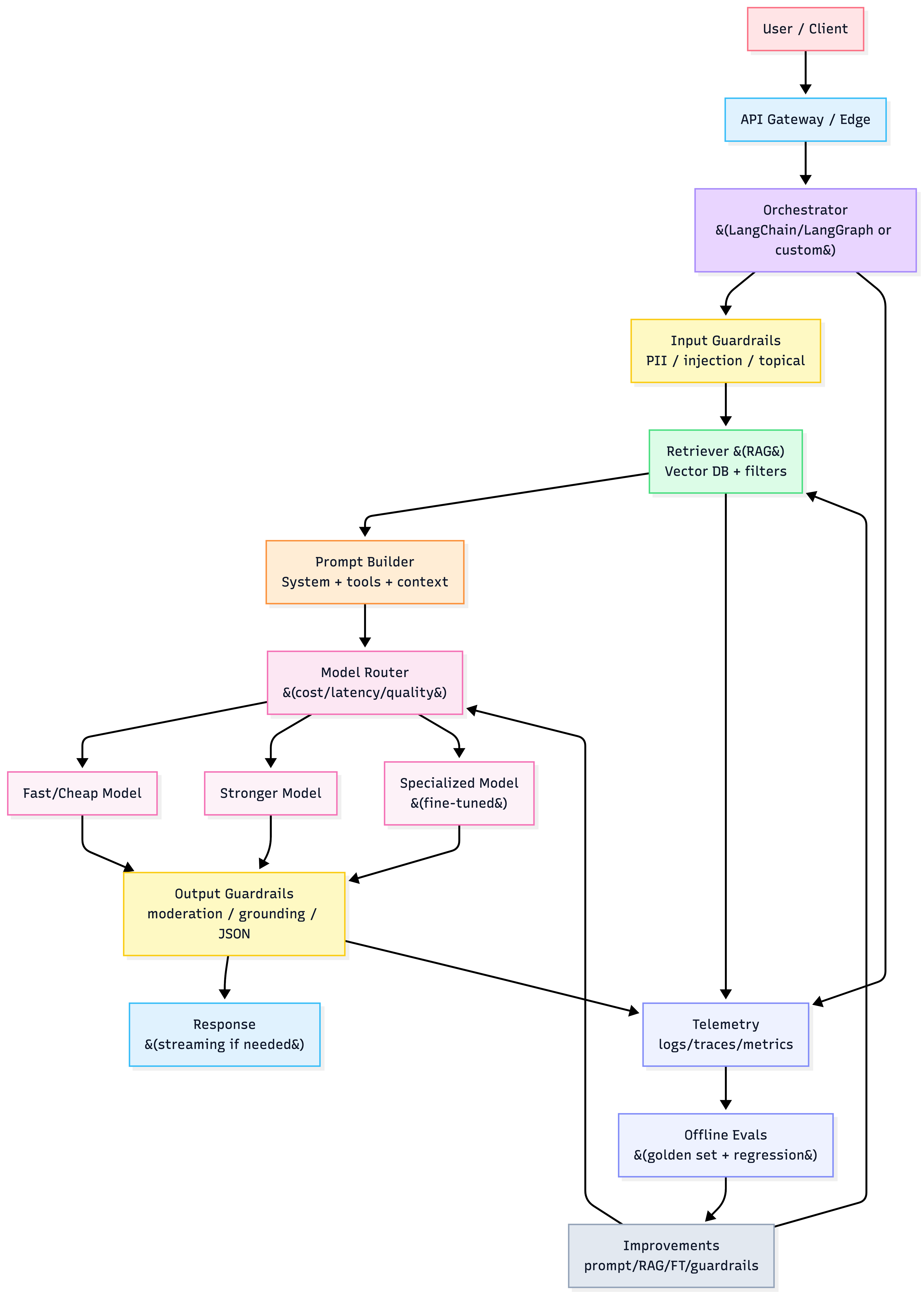 - Orchestration (routing, prompt assembly, tool calls, retries)