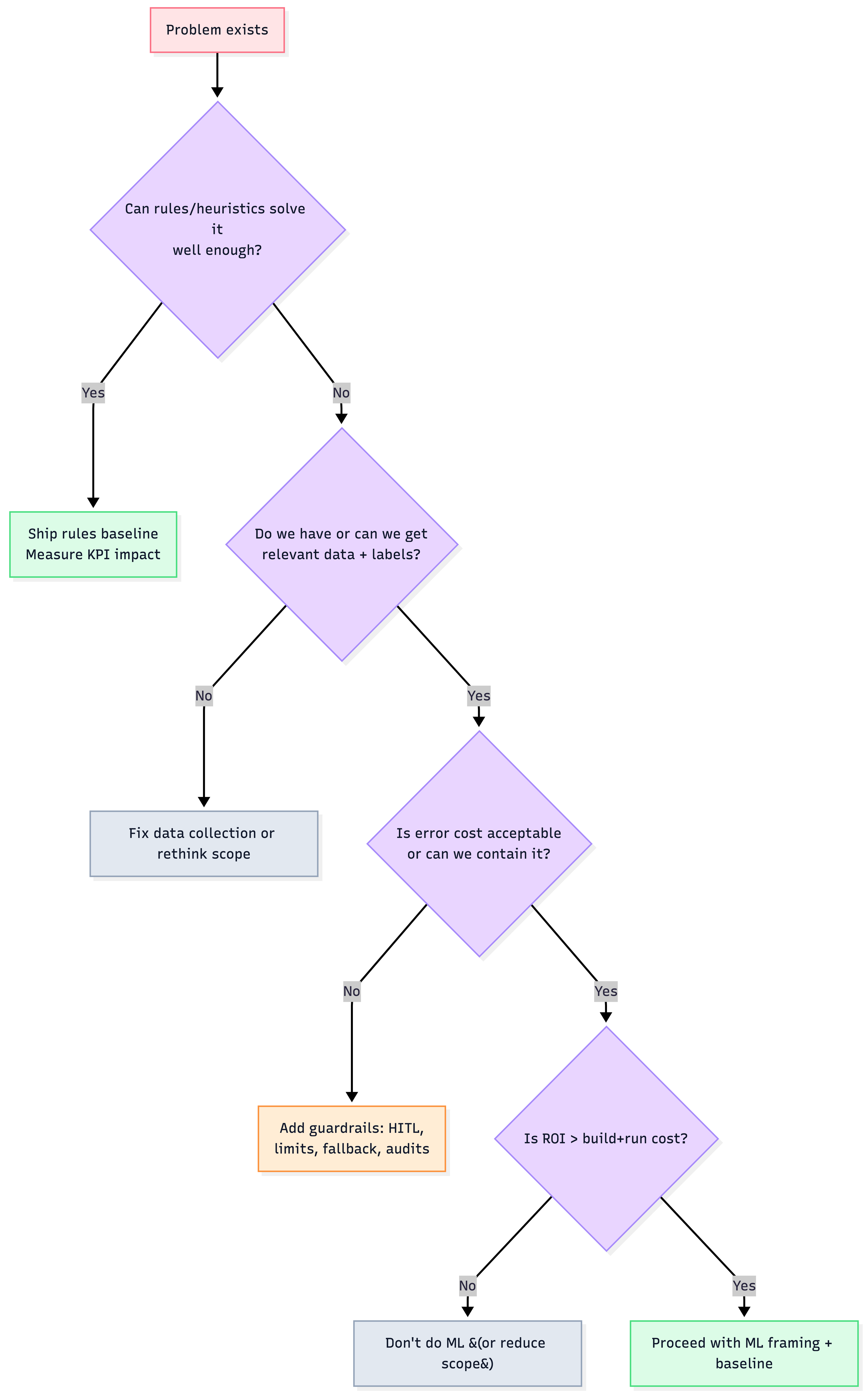 - Define baseline (rules / heuristic / existing system)