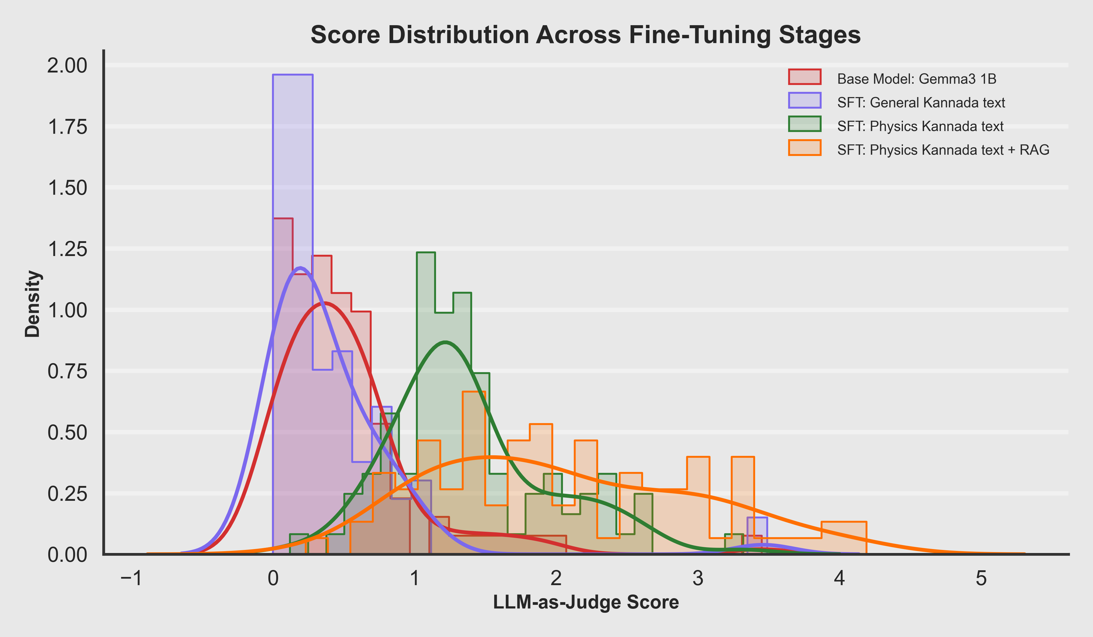 The progressive right-shift in score distributions demonstrates that each stage adds measurable value: fluency → reasoning → grounding.