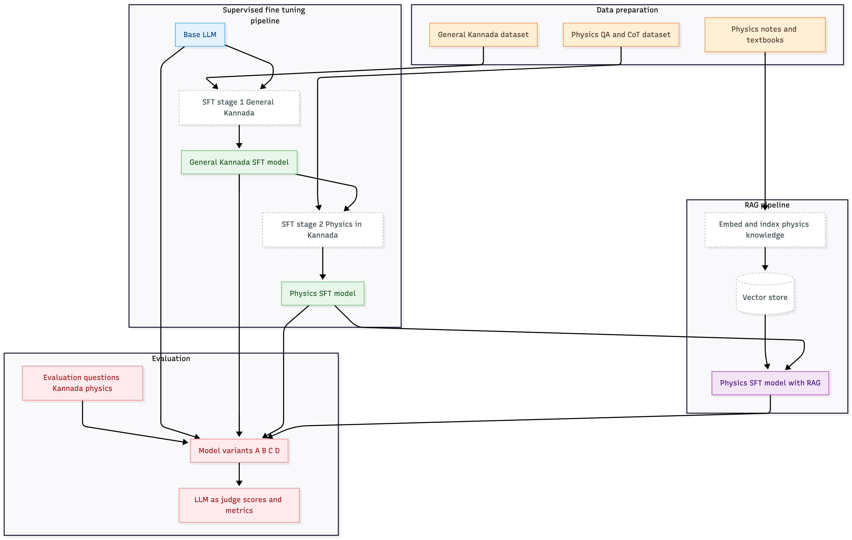 The complete training pipeline flows from a base open-source model through two stages of SFT (Kannada language → Physics reasoning) and finally RAG integration for factual grounding. Each stage builds on the previous one to compound improvements.