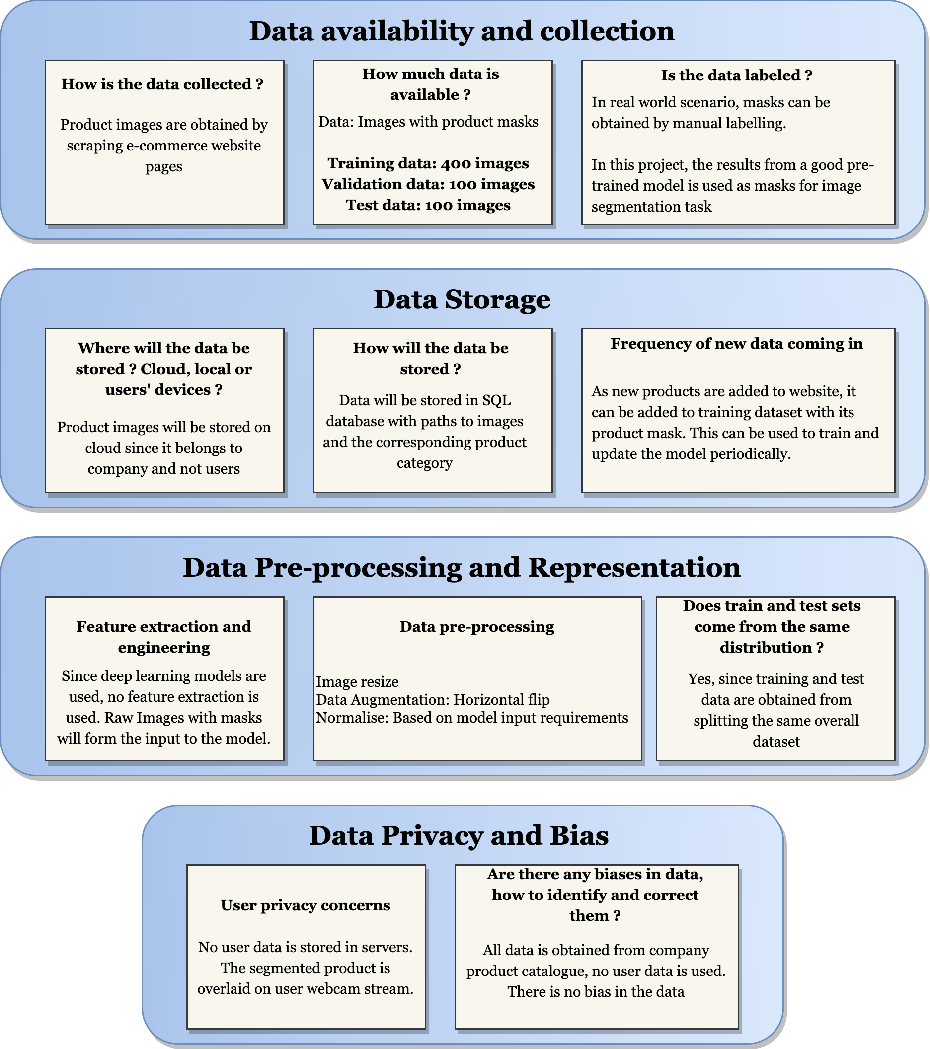One of the major challenges in a Machine Learning project is to handle the various parts of the Data Pipeline such as Data Collection, Data Storage, Data Pre-processing and Representation, Data Privacy, Bias in Data. It is important to handle these aspects of Data pipeline and the following block-diagram answers all the questions regarding handling data.