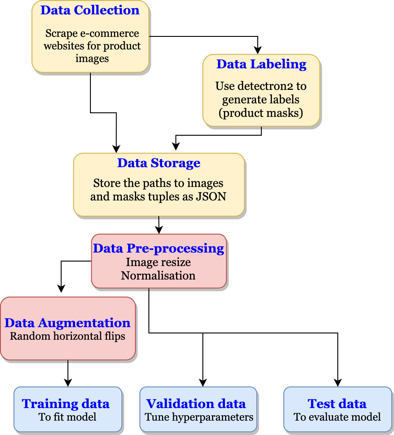 After scraping for product images and obtaining reference masks using pre-trained model, the data is stored in a JSON file (paths to images and masks). Pre-processing is then performed on this dataset after which the dataset is divided into 3 sets,