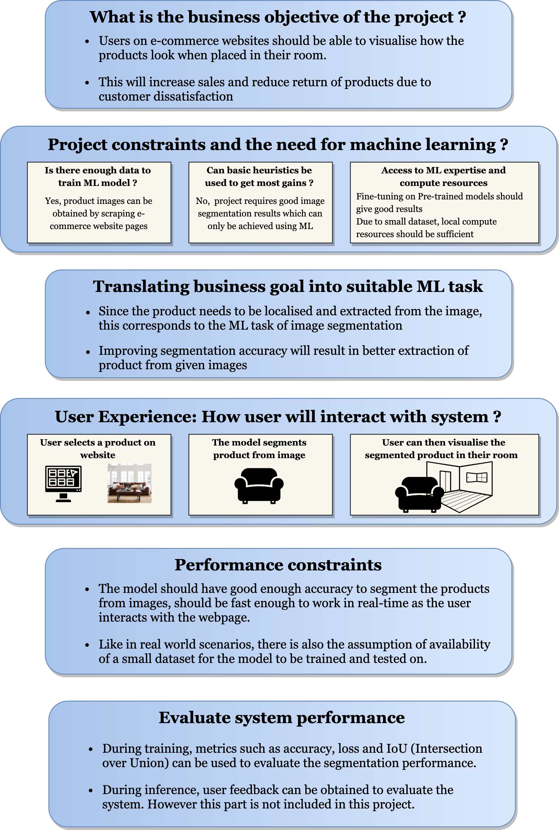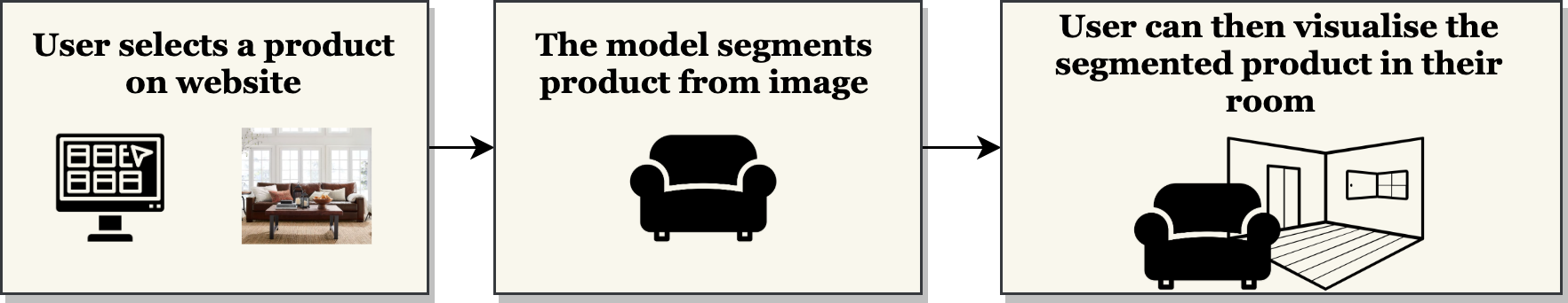 The Solution: The project aims to address this issue by providing an option for the user to segment the product from the image and then visualise how it fits in their own home. This is done by using an Image Segmentation Model which can separate the predefined set of product categories from the rest of the image, which can then be placed on a video stream of the user's room for visualisation.