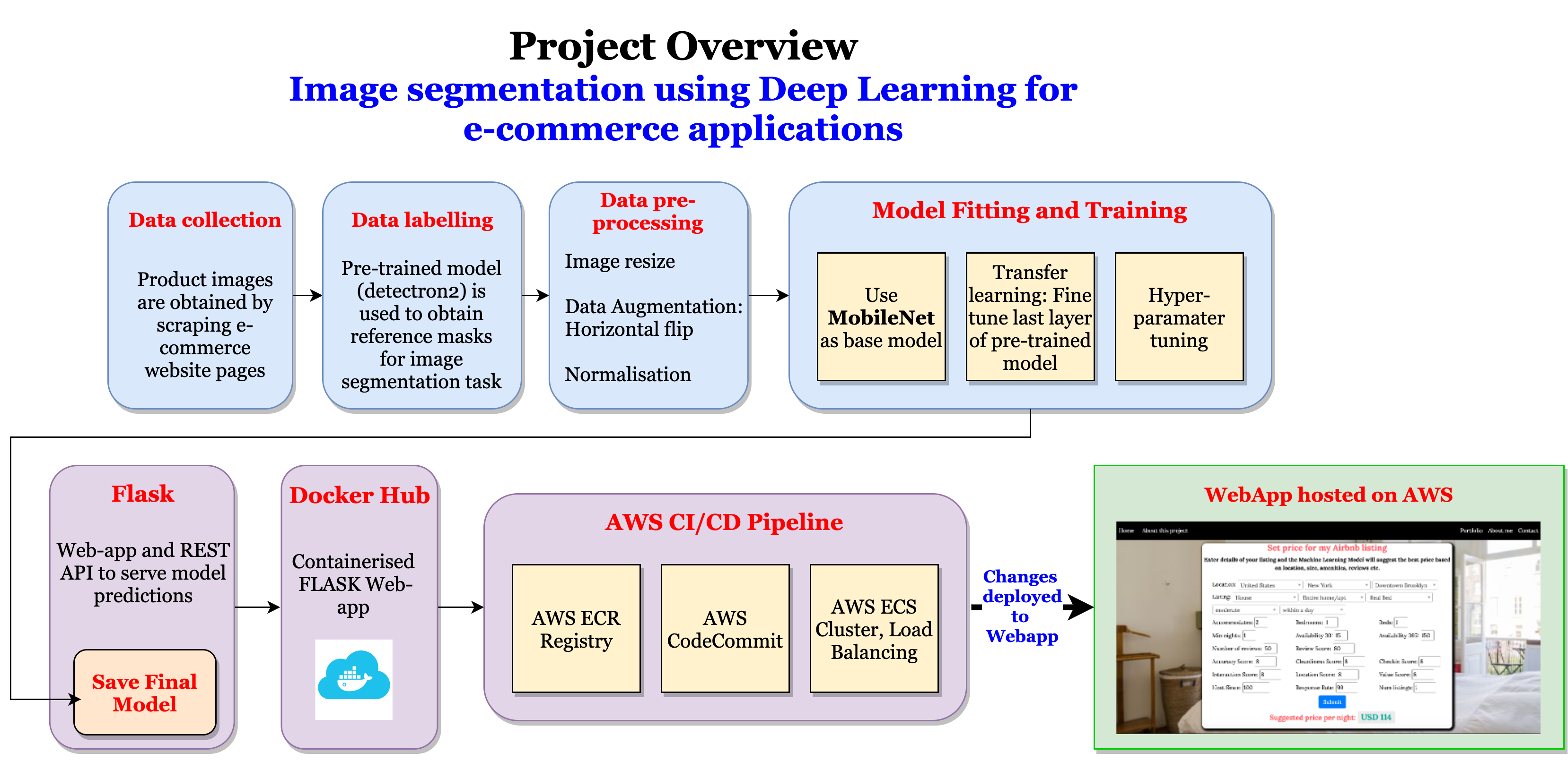 The project aims at using image segmentation for products on e-commerce websites. It involved creating dataset by scraping product images, using transfer learning to fine-tune the pre-trained deep learning model to perform segmentation of products from images. The Model predictions were served using FLASK Webapp, containerised using Docker and deployed on AWS through CI/CD Pipeline.