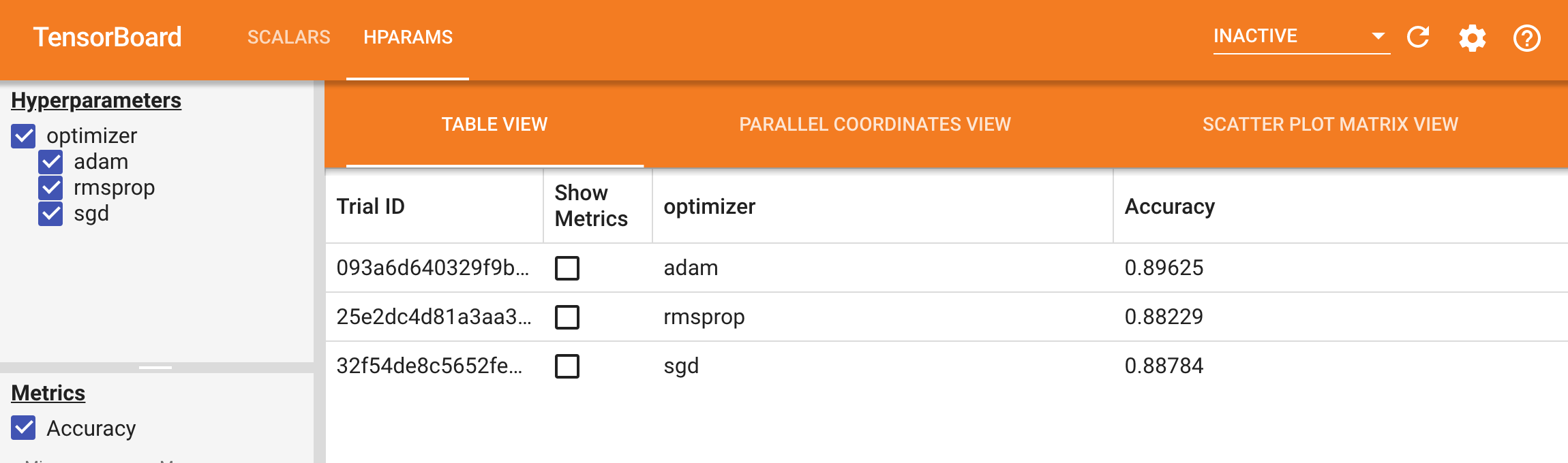 In this experiment, the performance of the Model is tested with various options for optimiser: Adam, SGD and RMSProp, the results for which on the Tensorboard is presented here,