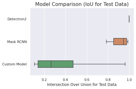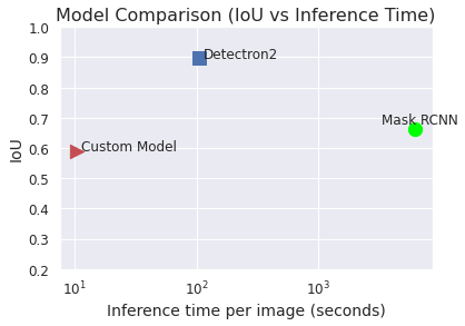 The following figures compares the performance of our Custom Model against the Baseline Models. It can be observed that although there is a drop in IoU for the Custom Model, the evaluation time is less than 1/10th of the best time for any of the Baseline Models. The drop in IoU can be improved by training the Custom Model with a bigger dataset.