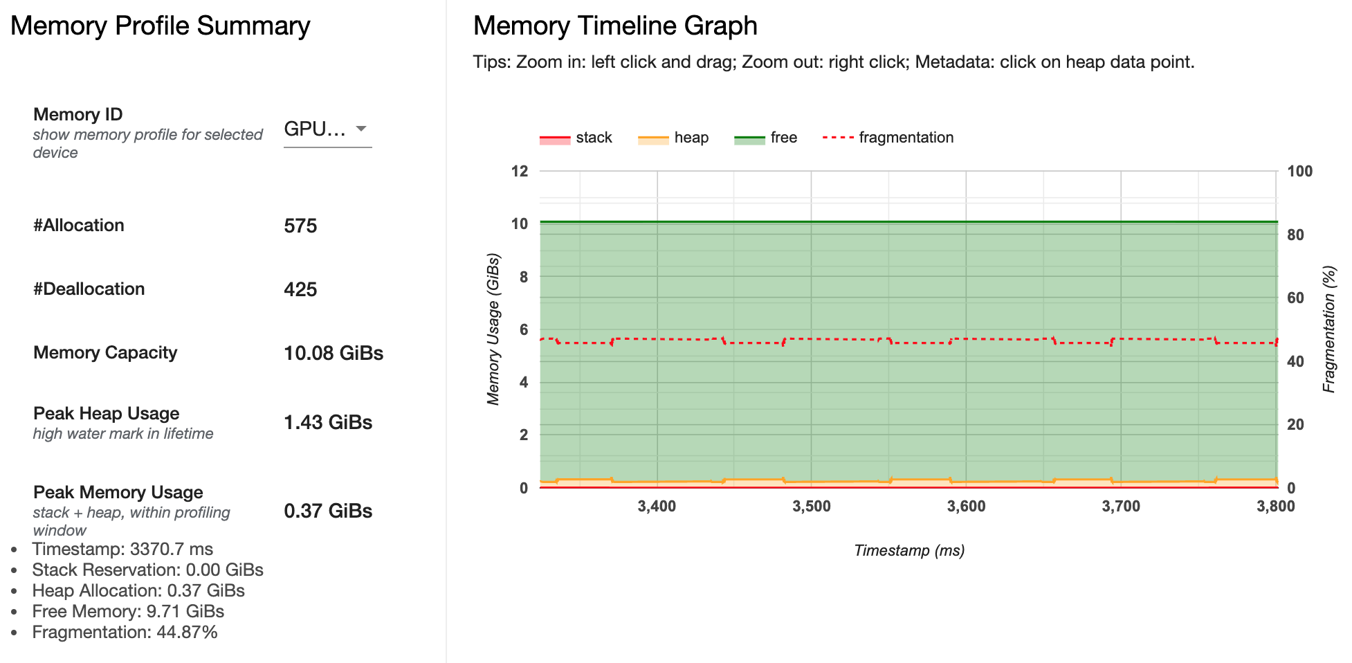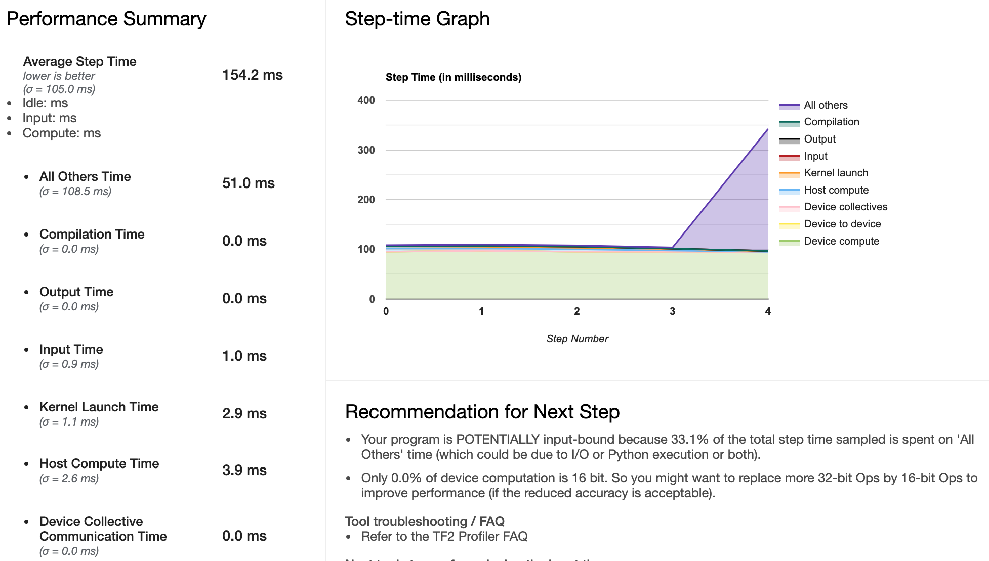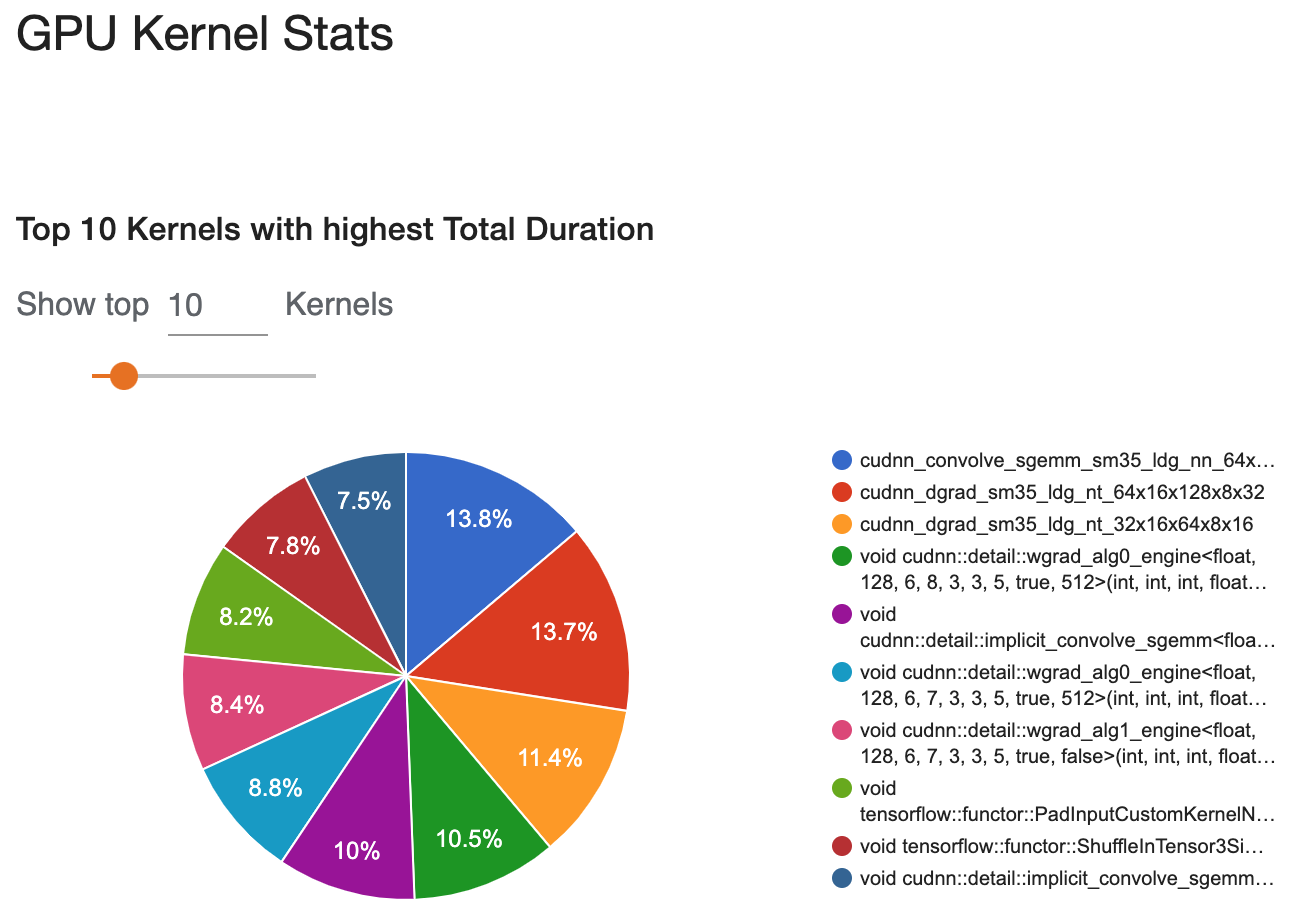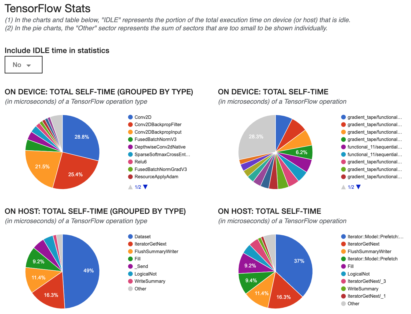 Tensorflow's Profiler makes it easier to track various metrics such as Time Taken on Host, Time Taken on Device, Time Spent for various operations on GPU, Memory Profile and Performance Summary, the stats for which are presented in the following figures below.