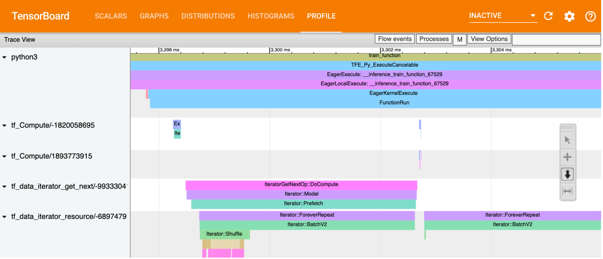 The timeline for various Input Data Pipeline operations as seen in Tensorflow's Trace Viewer is presented here,